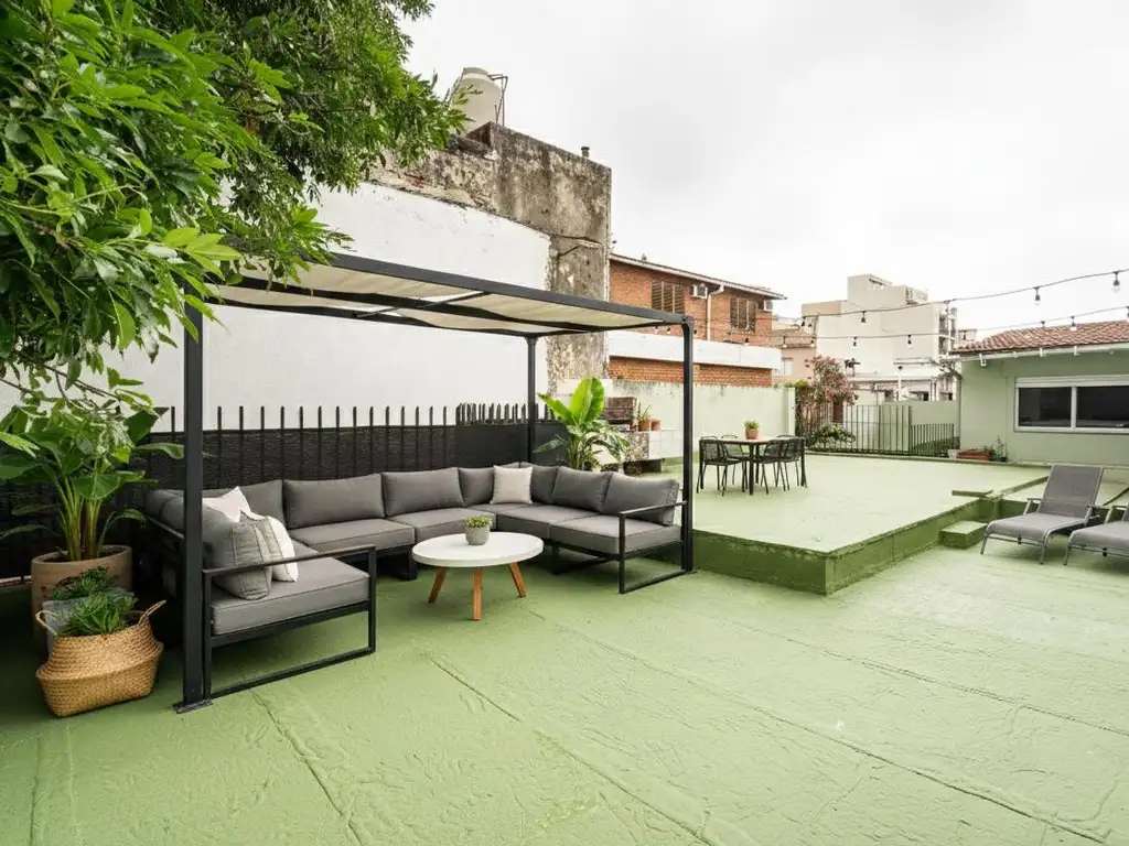 El patio interno organiza el área de lavadero y servicios, y conecta con la planta alta donde sorprende un quincho completo con cocina y baño propio. Desde allí accedés a una terraza transitable con parrilla que ocupa toda la superficie, creando un verdadero espacio de disfrute al aire libre.