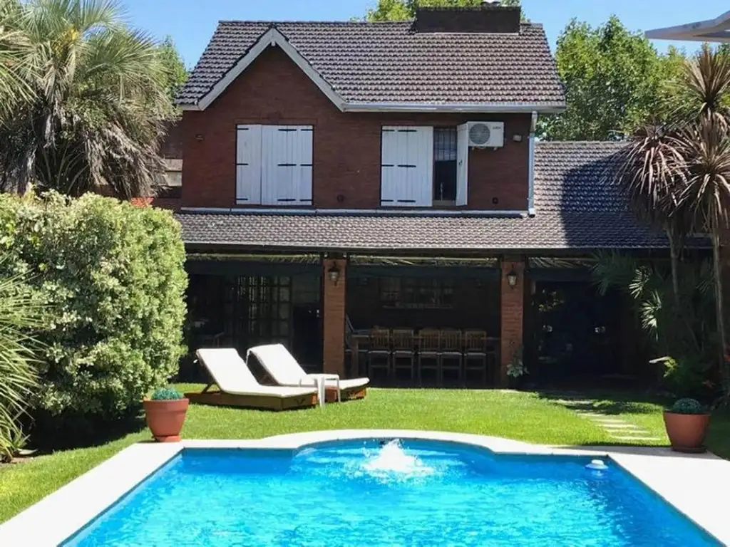 Planta Baja: Espacios Sociales y Aire Libre Al ingresar, un hall de recepción da paso a un cálido living diseñado en desnivel con ventanal al frente, otorgando distinción al ambiente. El comedor diario se integra armónicamente a la cocina mediante una barra desayunadora, ofreciendo ventanales con salida directa a la galería, ideal para la circulación de aire y luz natural. La cocina destaca por su equipamiento: muebles bajo mesada y alacenas de madera maciza en estado impecable. El exterior es el protagonista: una amplia galería con parrilla invita a reuniones sociales, continuada por un gran jardín parquizado y una piscina completa. Al fondo, cuenta con un galpón de guardado y bicicletero. Completan esta planta un toilette de recepción, lavadero independiente y un garage cubierto pasante con capacidad para dos vehículos, más un espacio adicional de cortesía entre la reja y el portón.