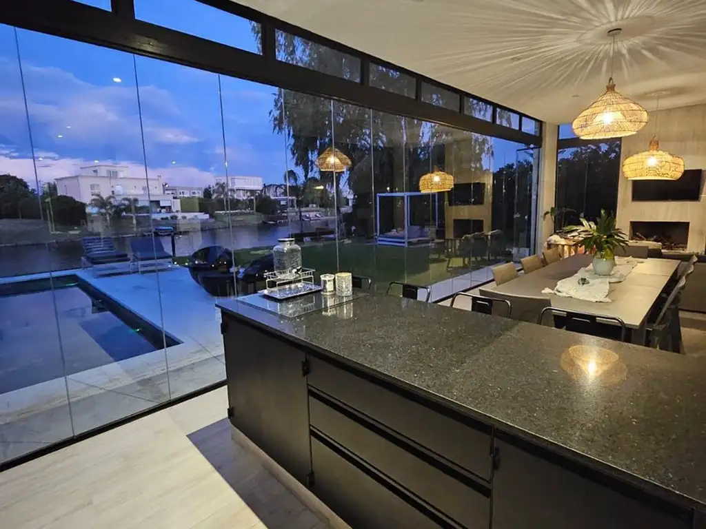 En planta baja entramos por un elegante hall de ingreso que conduce al área social compuesto por living comedor cocina, toilette, con géneros ventanales de piso a techo con vista al jardín, pileta, lago, muelle; a continuación de la cocina se encuentra el lavadero con amplio lugar de guardado con lugar para secarropa y lavarropa con salida exterior lateral y por oro lado, con otra entada independiente otra suite