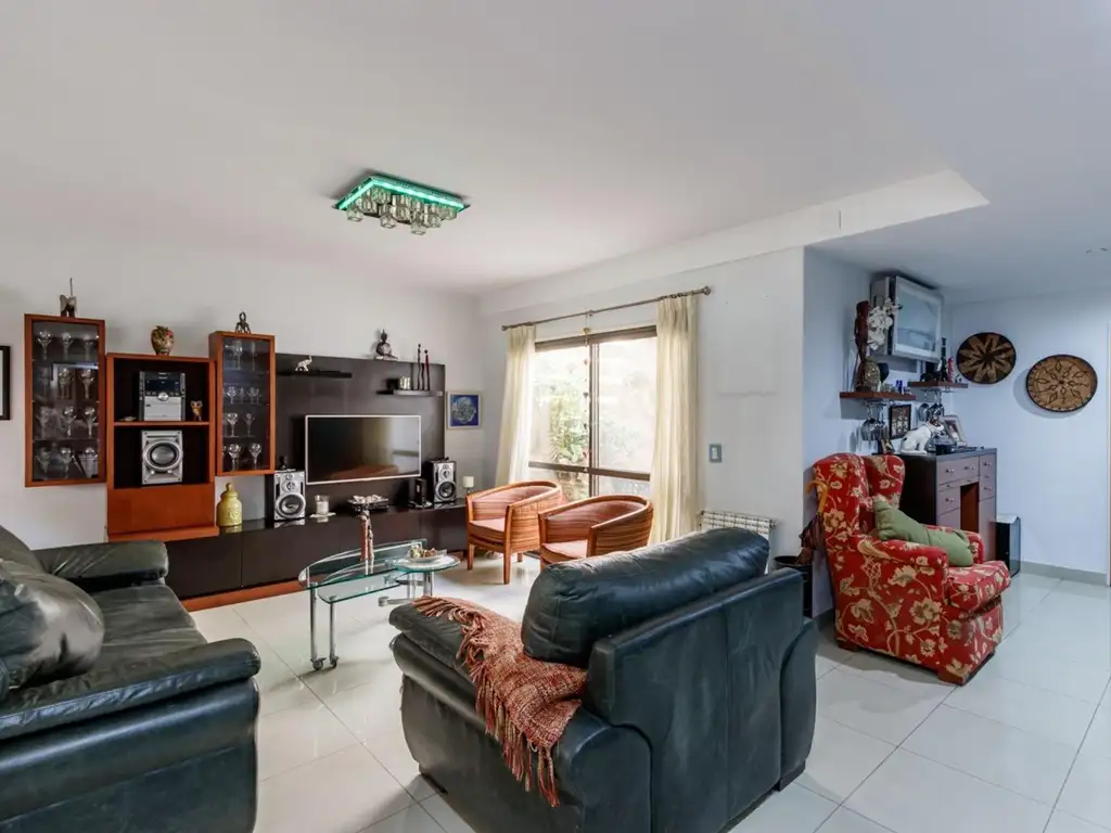 Planta Baja: Al ingresar, se encuentra un amplio living-comedor luminoso, ideal para recibir visitas. Un patio de invierno proporciona un espacio adicional que permite disfrutar de luz natural durante todo el año. La cochera simple facilita el estacionamiento. La cocina, separada y equipada con una moderna barra en L y una barra desayunadora, se integra con el comedor diario. Alberga también, dos dormitorios, ambos con placares empotrados, y dos baños, lo que garantiza privacidad para los residentes. Desde la cocina, se accede a un patio descubierto con parrillero.