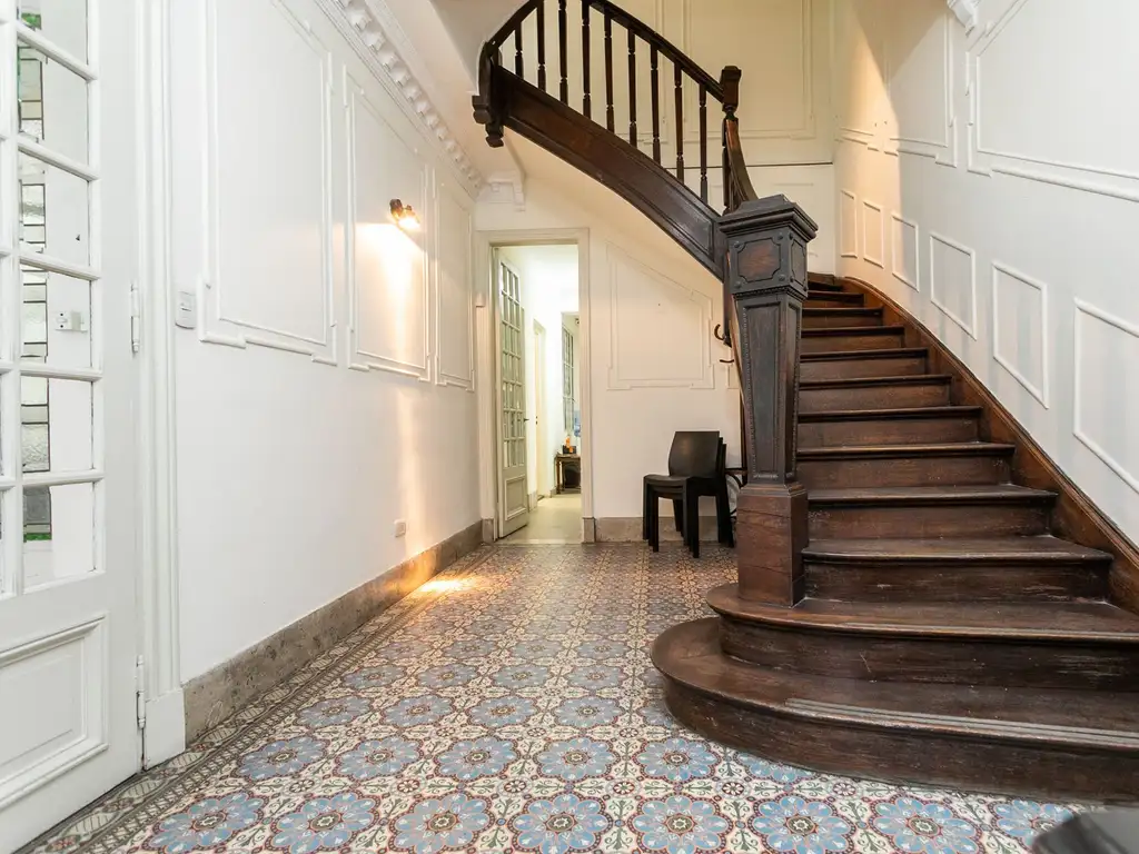 A la derecha hay un gran hall de distribución que conduce hacia el fondo. Allí hay un ambiente de guardado y dos baños de época tipo toilletes; hay doble circulación hacia el patio. A la izquierda nos encontramos con una importante e impecable escalera de madera para acceder al primer piso.