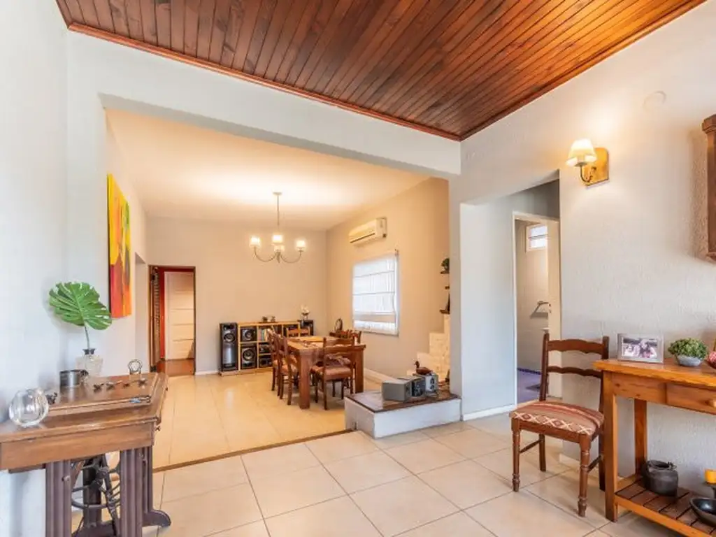 La casa está desarrollada en planta baja sobre un gran lote con más de 13 metros de fondo libre. Cuenta con tres dormitorios, dos baños completos, un amplio living comedor principal, un segundo espacio de estar o comedor diario, cocina independiente con muy buena ventilación y una dependencia que puede funcionar como escritorio, dormitorio de servicio o espacio de guardado.