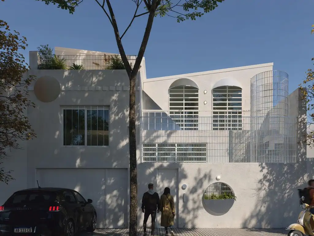 Planta baja: cochera, ingreso de servicio con lavadero, ingreso principal desde patio con gran abertura. Cocina, comedor, estar y baño de invitados.