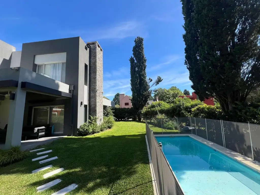 El exterior de la propiedad es igualmente atractivo, con una gran galería equipada con parrilla y bacha, ideal para disfrutar de reuniones al aire libre. El jardín alberga una piscina climatizada por energía solar.