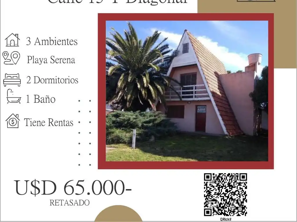 Chalet estilo "Alpino", tres ambientes distribuidos en dos plantas, ubicado en excelente zona del Barrio Serena, sobre calle 15 y Diagonal (calles asfaltadas).