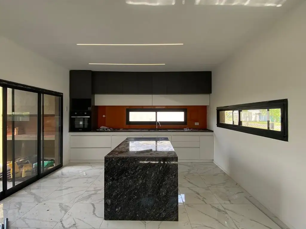 Cocina de diseño: Mobiliario de alta gama en tonos oscuros y blanco, mesada de granito premium e imponente isla central.