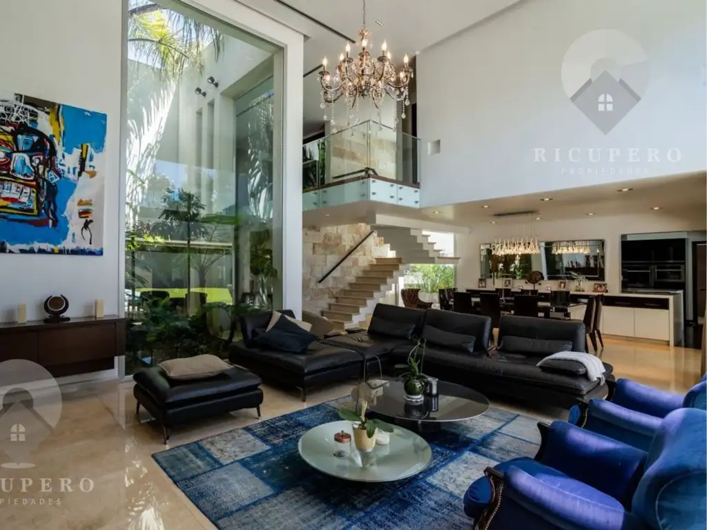 En planta baja, se destaca un amplio living-comedor de doble altura que brinda una sensación de amplitud y luminosidad, con grandes ventanales que ofrecen vistas privilegiadas hacia dos patios internos: uno decorado con plantas exóticas y otro con una elegante fuente de agua, creando un ambiente relajante y sofisticado. La cocina, completamente equipada con electrodomésticos de alta gama, combina funcionalidad y elegancia, con generosos espacios de guardado. También dispone de un lavadero independiente y una práctica despensa. Al ingresar, se encuentra una habitación con baño privado que puede utilizarse como oficina, escritorio o cuarto de huéspedes, y un toilette de recepción moderno completa esta planta.