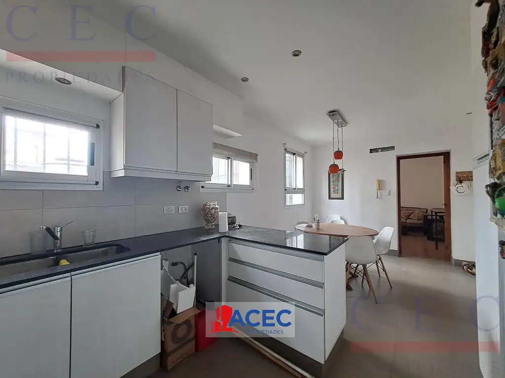 Luminosa cocina-comedor diario con amplia mesada de mármol negro, bacha de acero inoxidable, grifería mono-comando. Pisos de porcelanato.