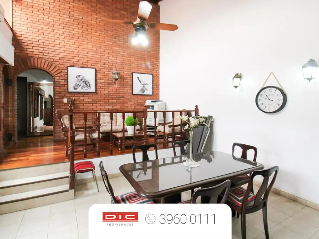 En la planta alta muy buena construcción con entrada independiente de la calle de unos 30 años aproximadamente , un chalet con techo de teja de 4 ambientes en impecable estado, construido 140m2 cubiertos aproximadamente. Consta de un amplio y luminoso living-comedor en desnivel de 6x4 con pisos tarugados, 3 dormitorios con placard con pisos alfombrados, cocina-comedor y baño de 5x3,50 con muebles bajo y sobre mesada, anafe empotrado mas extractor y horno, persiana de madera tipo barrio con rejas en aberturas y una terraza de 5x4 metros.