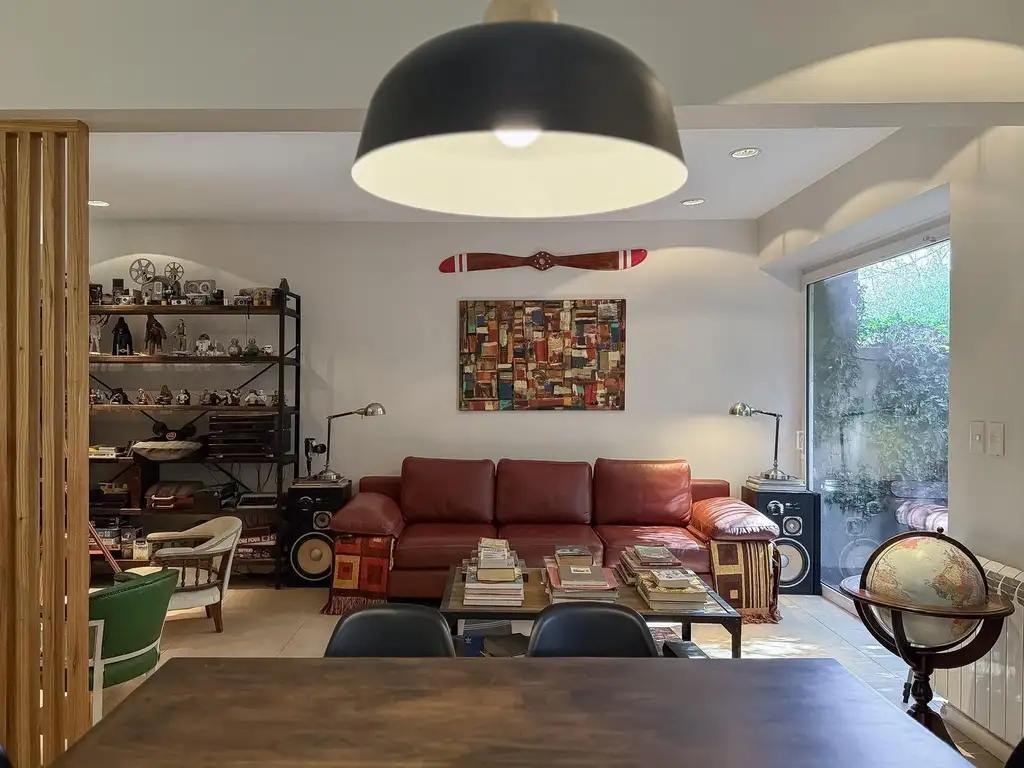 El living comedor se presenta como un ambiente integrado, luminoso y con amplios ventanales que enmarcan vistas al jardín, generando conexión directa con el exterior. Incluye una salamandra y salida hacia el jardín frontal, enmarcado por vegetación.