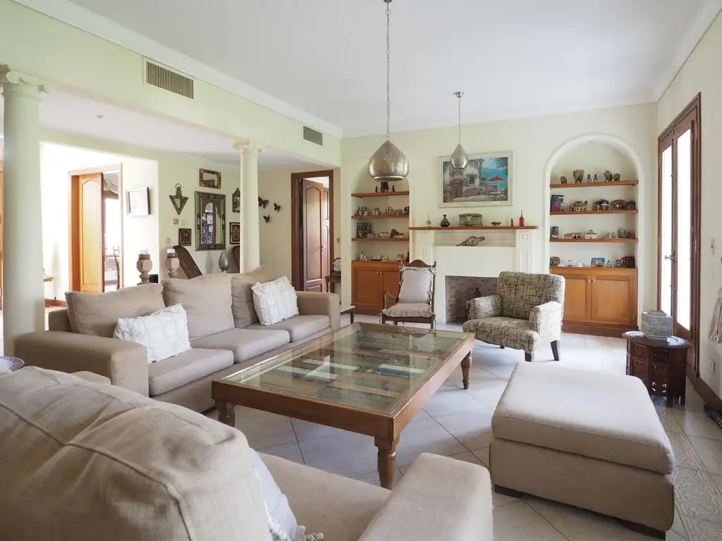 Sobre lindisimo terreno central de 1340 metros, casa estilo frances de 400 metros. Planta Baja: Gran hall de entrada en doble altura. Living con chimenea y tres grandes ventanales para abrir con salida directa hacia el jardin. Comedor con conexion directa hacia la cocina. Sala de audio con puertas corredizas hacia el living. Escritorio con bano con ducha (o posibilidad de 4to dormitorio). Amplia cocina con isla y mesa comedor diario con butacas altas junto a la ventana.