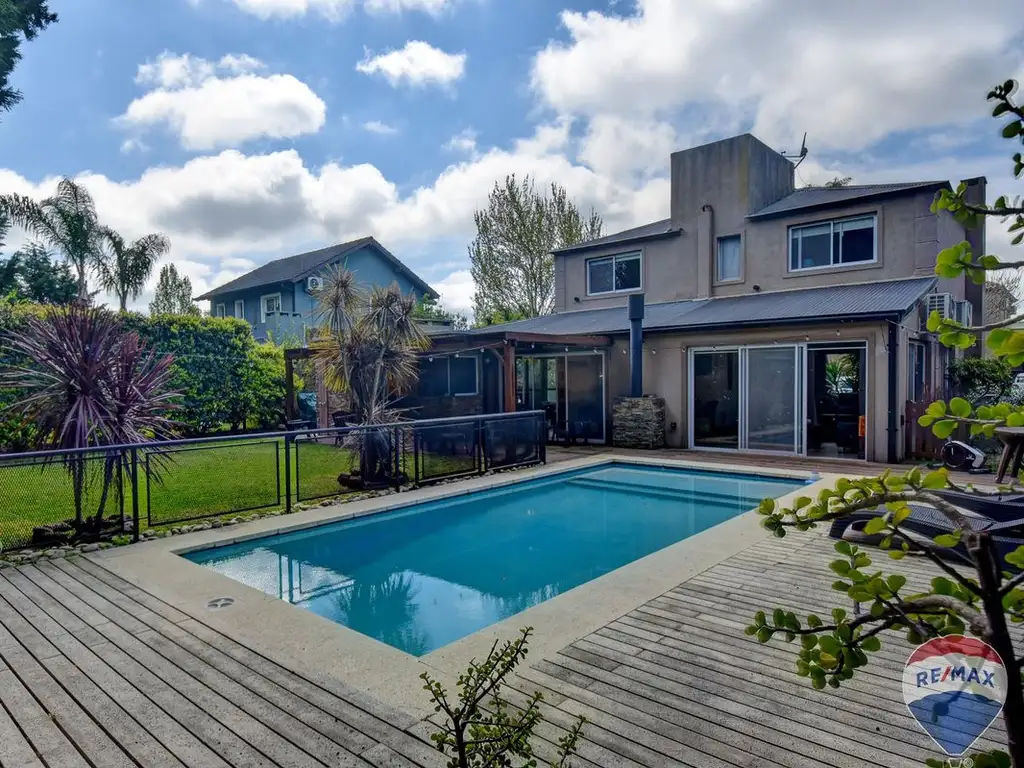El verdadero encanto de esta casa se encuentra en su exterior. La galería cubierta, con parrilla y barra exterior e interior, se convierte en el lugar perfecto para tus reuniones. Desde aquí, podrás admirar el parque privado que alberga una piscina con solárium, un espacio diseñado para el relax y la diversión.