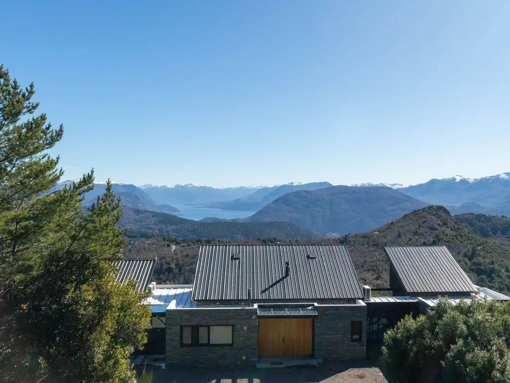 En la casa principal nos encontramos con un muy amplio living de concepto abierto, cocina comedor con barra desayunadora. Los amplios ventanales permiten el ingreso de luz además de poder acceder al deck terraza para disfrutar de las vistas tanto hacia el lago Lacar, el cordón montañoso del Cerro Chapelco, la cancha de golf de Vallescondido, la cordillera y el volcán Lanín.