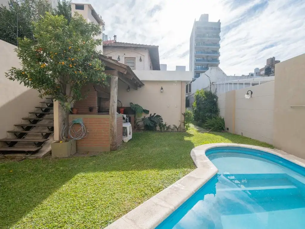 El exterior de la vivienda posee su aspecto distintivo y especial: un amplio jardín verde con piscina, sector de asador y galería descubierta. Además, cuenta con habitación de guardado en planta alta con toilette.