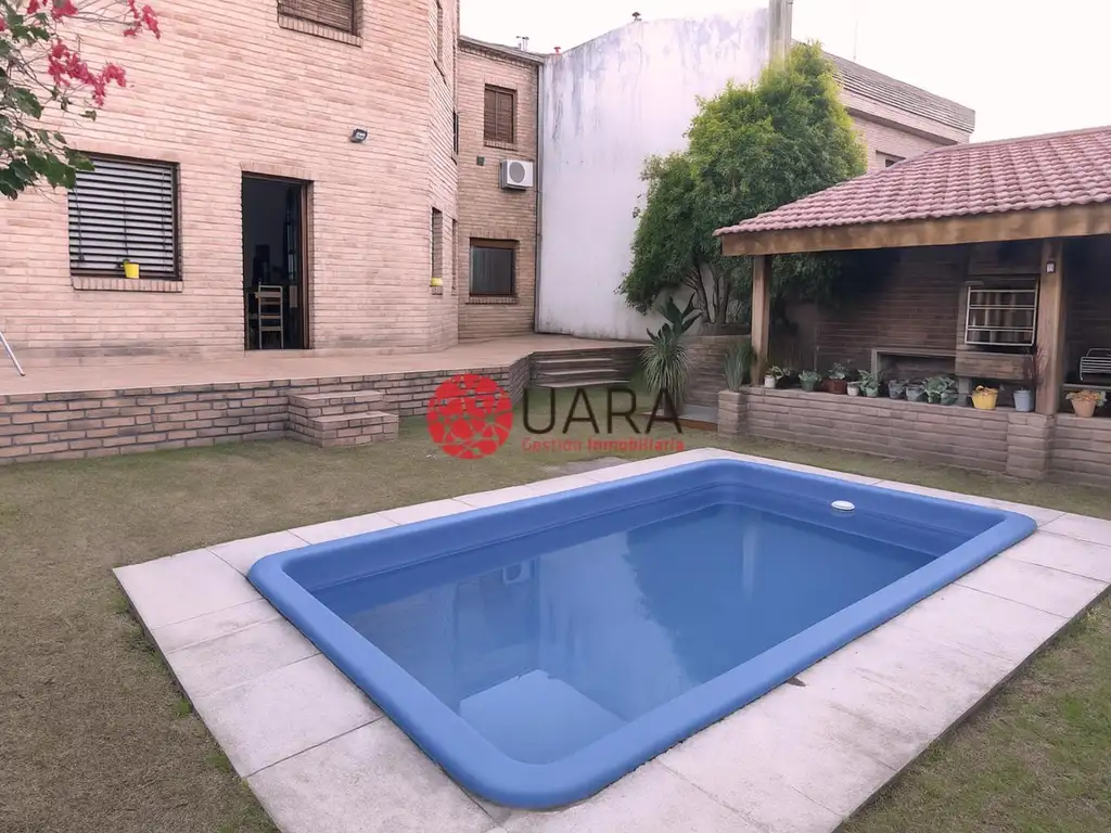 Se accede a Living comedor amplio con aberturas de madera y vidrios biselados, Oficina, Toilette, Cocina comedor con muebles bajo mesada y alacena en madera, dependencia de servicio completa con baño completo, Garaje doble con portón automático, Patio parquizado con Pileta y Quincho Techado