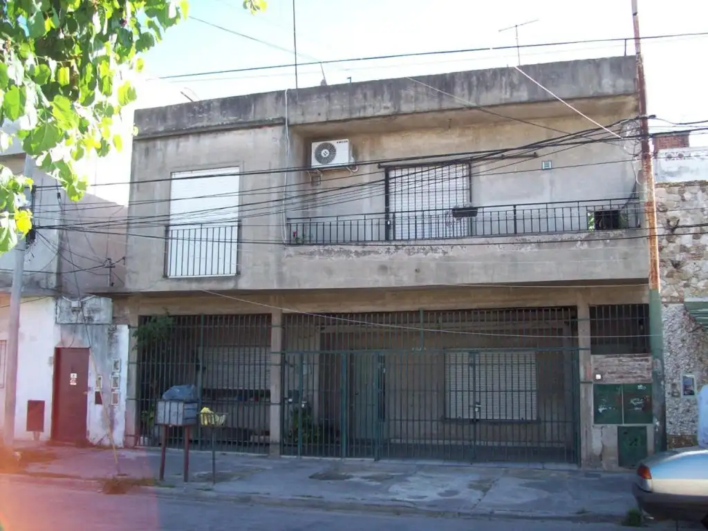 Casa en Planta Alta (Frente): living comedor, cocina comedor, 2 dormitorios, baño completo, patio con parrilla, galpón de guardado y terraza.