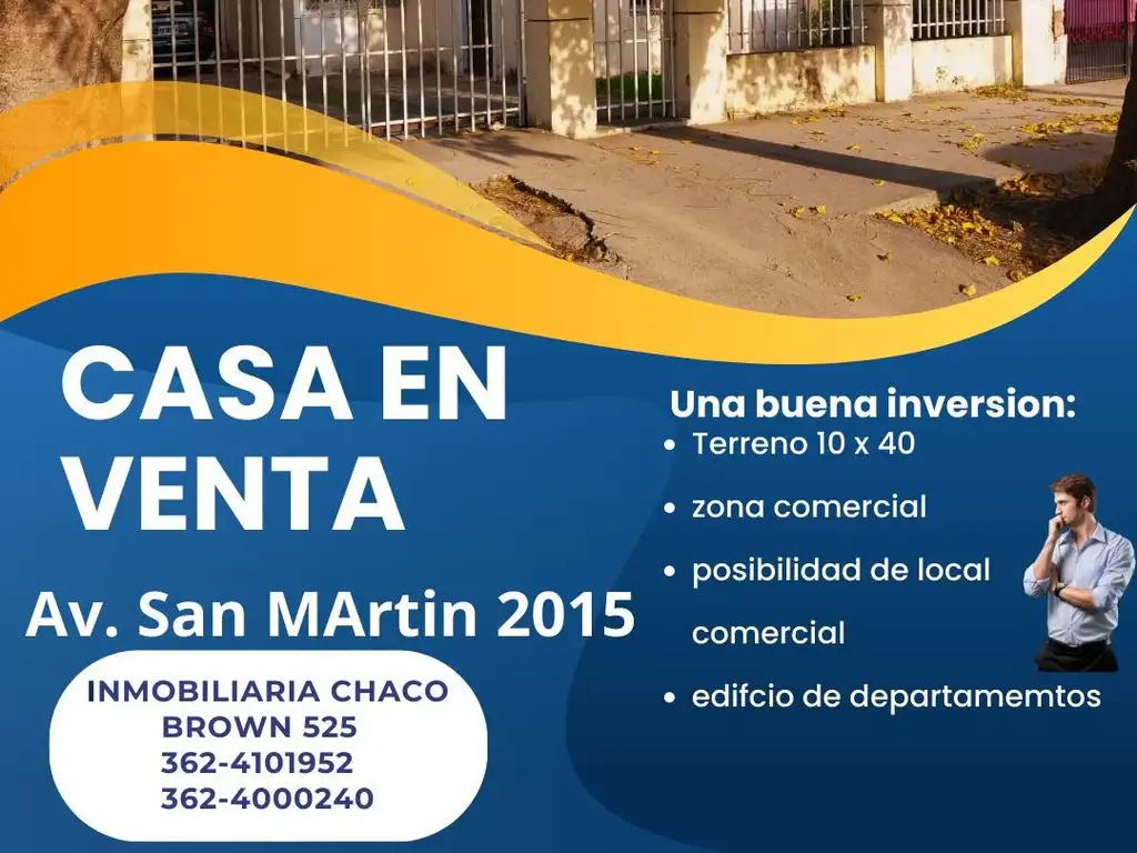 Av. San Martin N° 2015, CASA EN VENTA: "por las medidas es el lugar para inversión en torre de departamentos o local comercial tipo Galpón". Situada sobre la Av. San Martin N° 2015 de Resistencia: se trata de una vivienda familiar en un buen estado, con muy buen entorno sobre la Av. San Martin, de una planta. Todo en condiciones de ser alquilado, dos (2) dormitorios todos con amplias ventanas y placares, un baño, cochera para auto con portón, el terreno es de generosas dimensiones siendo de 10 mts de frente por 40 mts de fondo, lo que le da las mas variadas posibilidades de inversión patio de buenas dimensiones, habitación de servicio en el patio, galería.-
