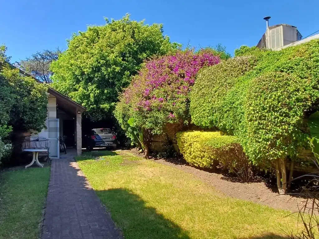 Casa reciclada con muy buen gusto y excelentes materiales. Se desarrolla de la siguiente manera: al ingresar encontramos una cochera cubierta y un amplio jardín al frente con portón de ingreso donde se pueden estacionar varios autos.