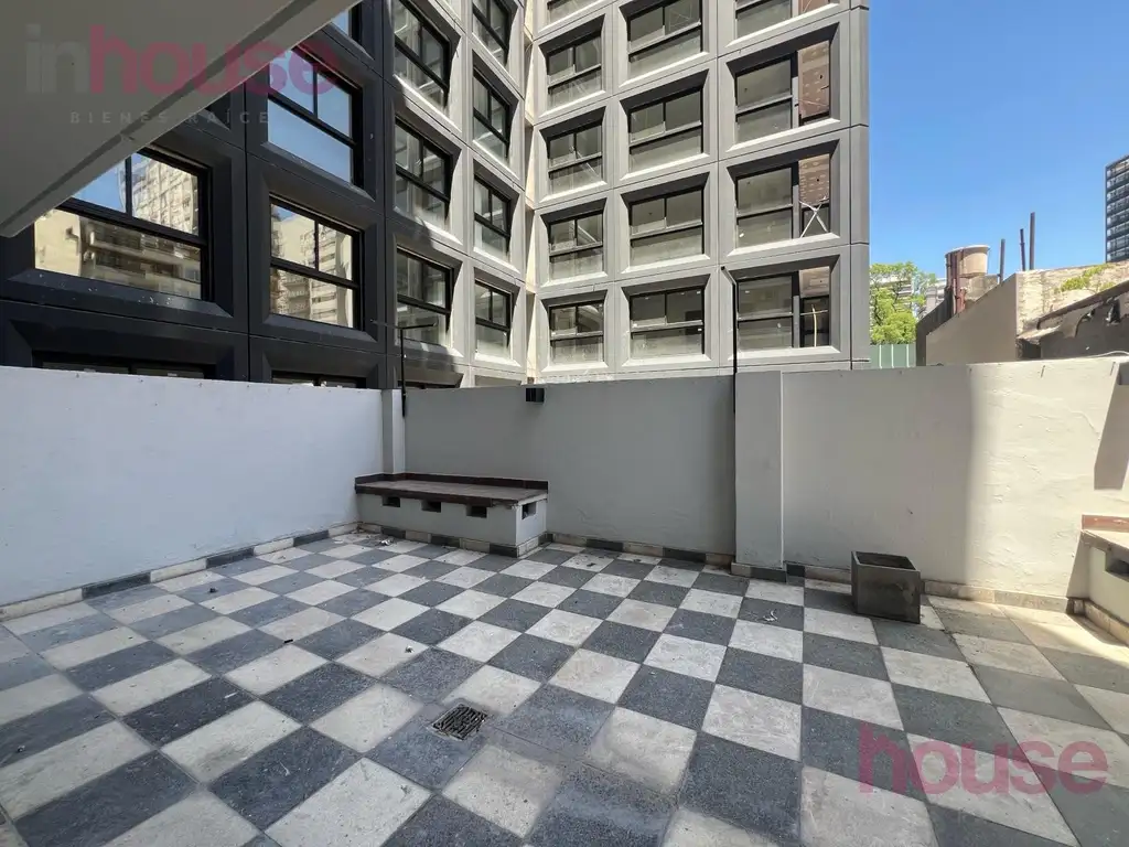 Living comedor con salida a gran patio, dos dormitorios con salida al patio y un baño completo.