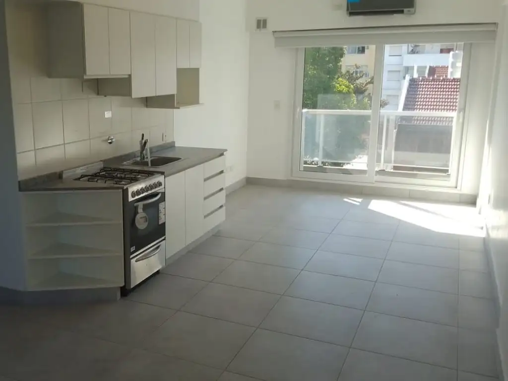 Departamento de un ambiente pensado para ser divisible. Cuentacon living-habitación con salida al balcón. Cocina integrada con muebles y alacenas completo, cocina y horno a gas. Baño completo con bañera. Carpinterías de PVC con vidrios con cámaray control solar, pisos de porcelanato símil madera y calefacción de equipos Split frío/Calor.