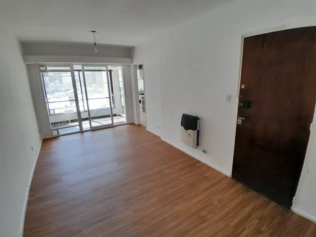 Living comedor con piso de madera flotante, calefactor, y balcón al frente con cerramiento.