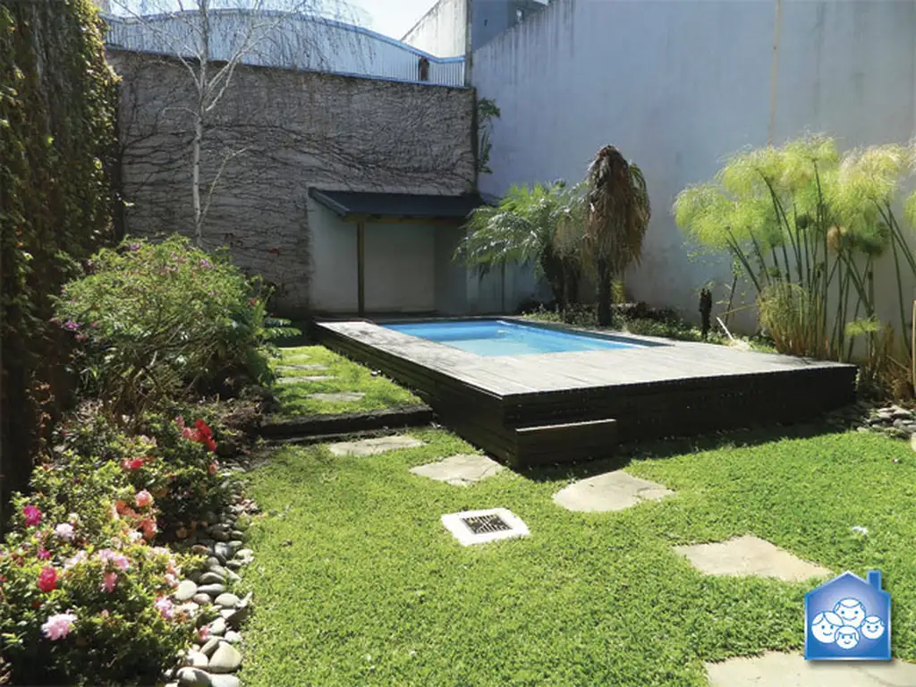 Jardin contrafrente con hermosa piscina.