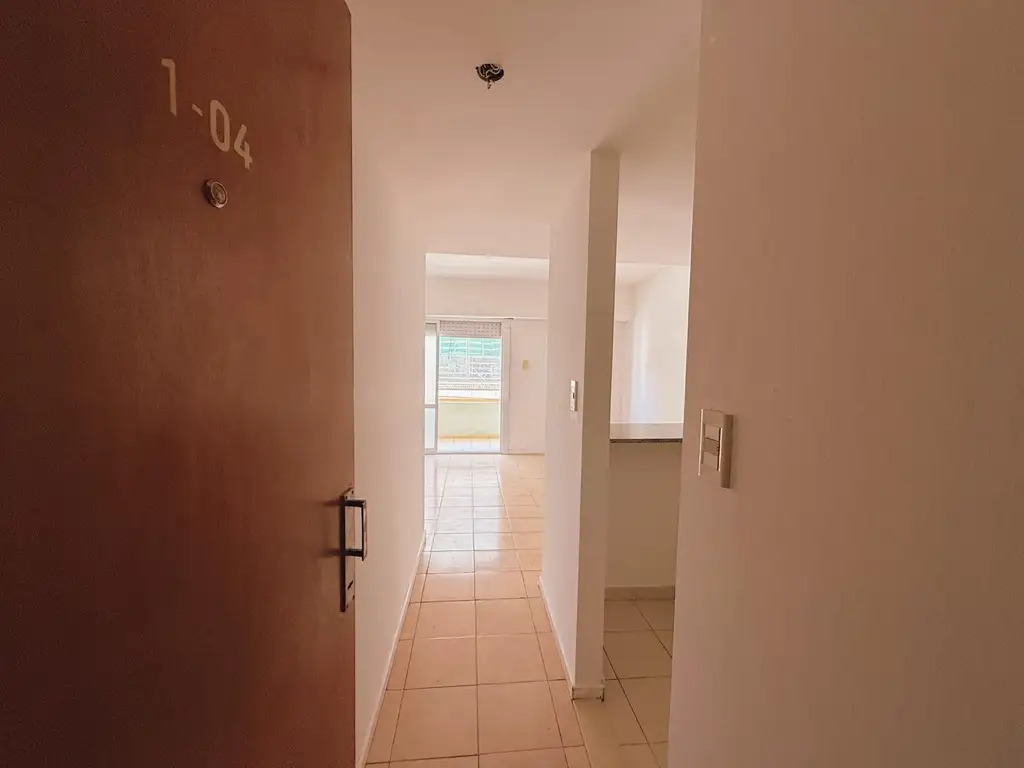Departamento de 1 dormitorio en alquiler, primer piso de escalera, externo con amplio balcón corrido, living comedor, cocina semi integrada con barra, dormitorio con placard, y baño completo con bañera.