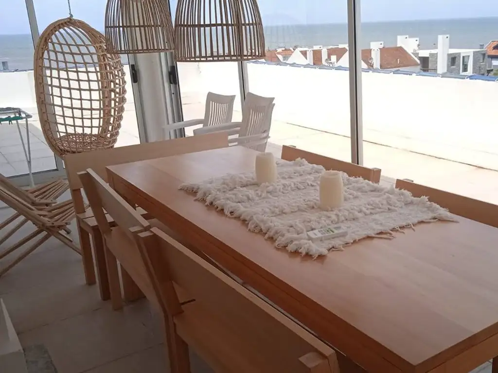 Pent house con vista al mar, con living comedor estar con amplia terraza finamente decorada, cocina definida amplia y equipada con terraza lavadero, 3 suites, terraza superior cerrada cómoda barbacoa completa con baño completo.