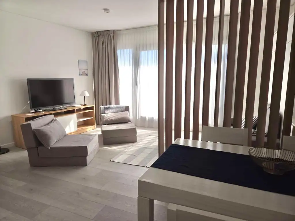 Muy luminoso y cómodo departamento a estrenar. Cuenta con interiores de Placard y mobiliario completo de cocina y baño. Cuenta con balcón y ventanal de piso a techo y su vista da al golf de Nordelta.