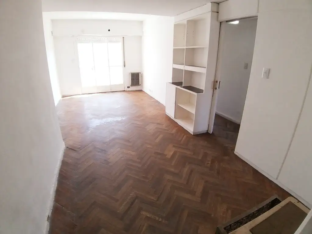 Living comedor con piso de parquet plastificado, salida al balcón y biblioteca.