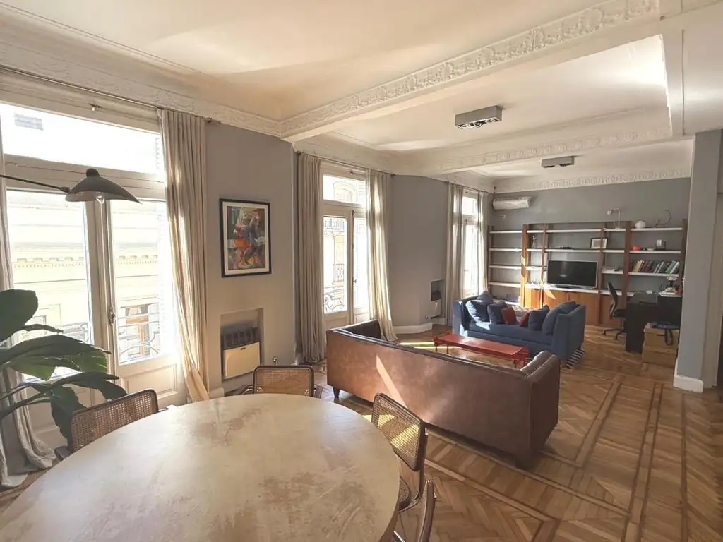 Livingcomedor espacioso, con pisos de parquet y grandes ventanales.