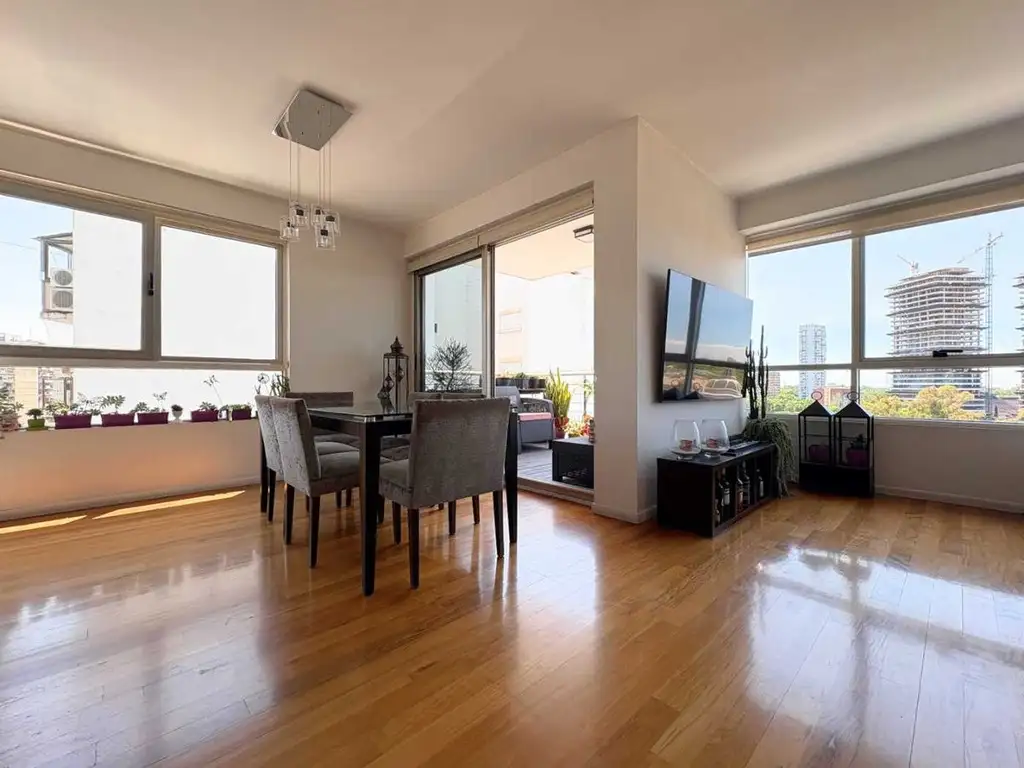 Gran living comedor con salida a balcón terraza. Toilette de recepción. Cocina integrada con gran espacio de guardado en alacenas y muebles bajo mesada con espacio para comedor diario . Lavadero incorporado. Conexión para lavavajillas. Son 3 amplios dormitorios, el principal en suite. Baño completo para los dormitorios. Amplio hall de distribucion ideal para escritorio, familiy o estar. Habitación principal de generosas medidas en suite con vestidor. Piso de madera impecable en los dormitorios y el living comedor. Porcellanato en la cocina. Inmejorable calidad de construcción con excelentes aberturas DVH y carpintería. Terminaciones únicas. Mamparas en los baños. Cortinas sun screen y black.outs. Son 115 metros totales. Tiene una cocheras y amplia baulera. Mucha luz.
