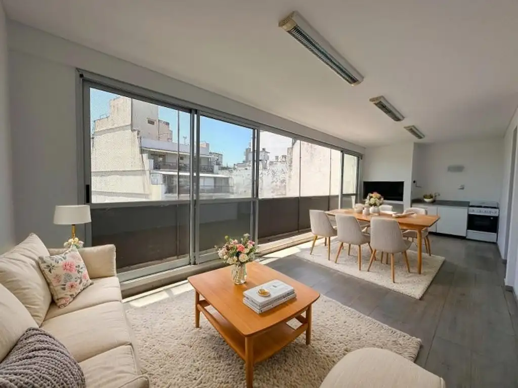 Tiene ventanal corrido con salida a un pequeño balcón corrido, orientación norte. Dispone de baño completo y cocina con horno a gas, bacha y parrilla. (La cocina permite realizar una división para ubicar la heladera, quedando espacio para el resto del amoblamiento).