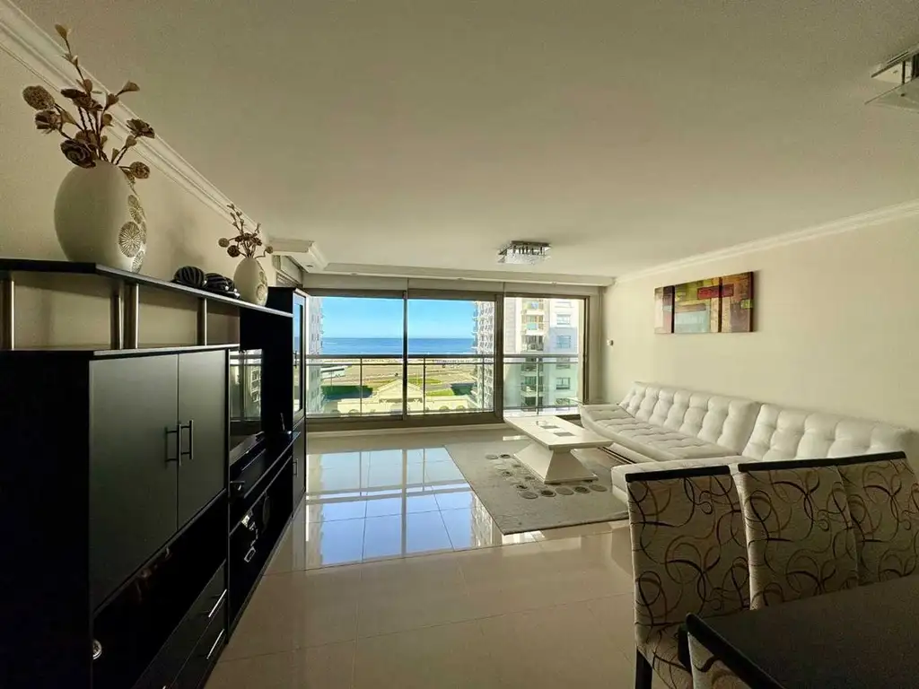 Living - comedor: Un espacioso y luminoso living con grandes ventanales que ofrecen vista a playa brava.