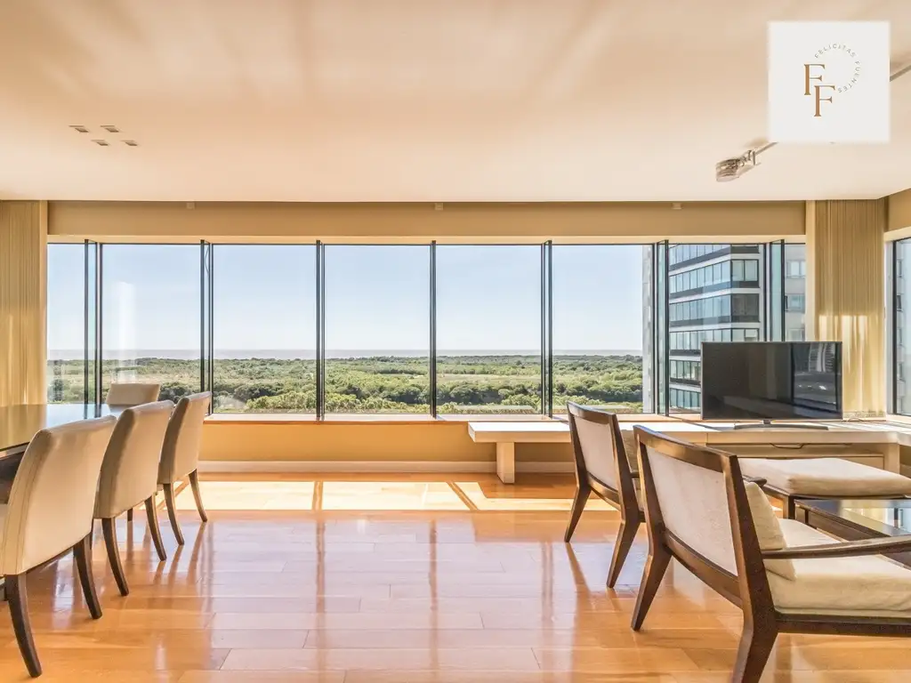 Living-Comedor amplio, muy luminoso, con vista abierta al Río y a la Reserva. Muebles de calidad, Smart TV, equipo de audio BOSE, cortinas verticales, cerraduras digitales y vidrios multilaminados.