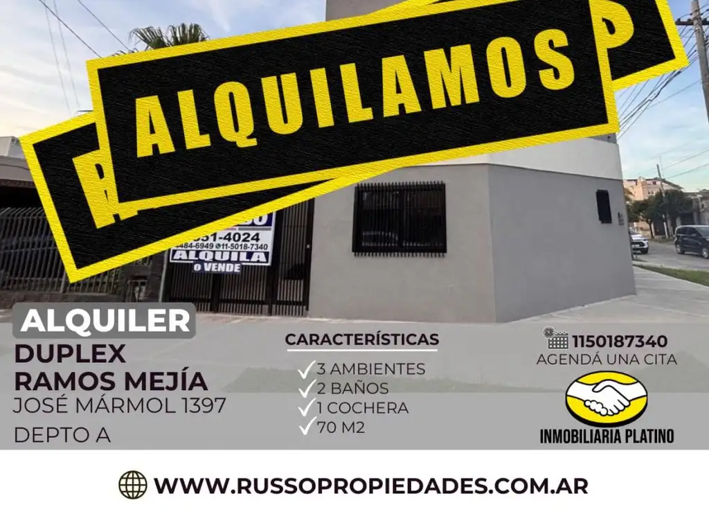 Se ofrece en alquiler un moderno departamento tipo dúplex ubicado en la localidad de Ramos Mejía, partido de La Matanza, sobre la calle José Mármol al 1300. La propiedad se encuentra a estrenar, lo cual garantiza instalaciones y terminaciones en excelente estado.