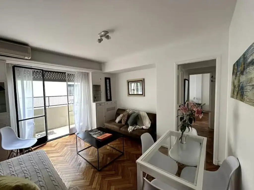 Excelente departamento ubicado en la mejor zona de Recoleta, reciclado a nuevo, ubicado en piso alto con orientación norte y muy buena luz natural, desarrollado en living comedor, balcon, 2 dormitorios, baño completo y cocina. Pisos de parquet. aire acondicionado split. Se alquila totalmentre amueblado. Calefacción y agua caliente central.