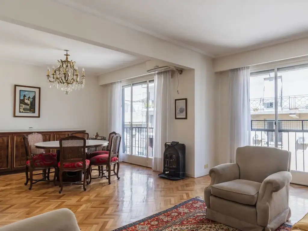 Living y comedor apaisados, comedor con salida a balcón; todos los ambientes son externos y muy luminosos. Toilette de recepción con ducha. Tres dormitorios, dos de ellos actualmente integrados en una master suite de generosas proporciones con posibilidad de restaurar el plano original a cargo del propietario .
