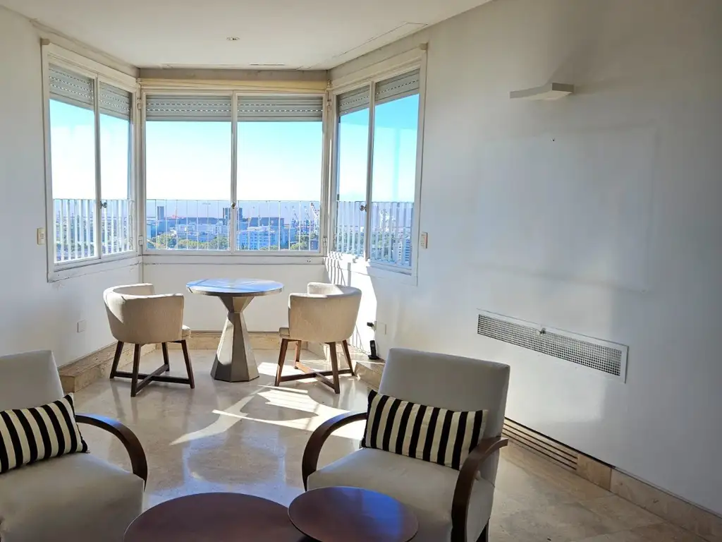 La propiedad cuenta con palier privado, ingresando a una amplia y luminosa sala de estar con ventanales con vista al río y la ciudad. El espacio de estar se integra con el comedor.