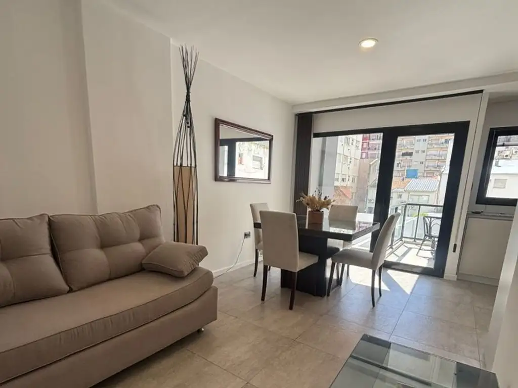 Al ingreso, amplio living comedor con sillón, TV, mesa y sillas. Salida a amplio balcón con parrilla.