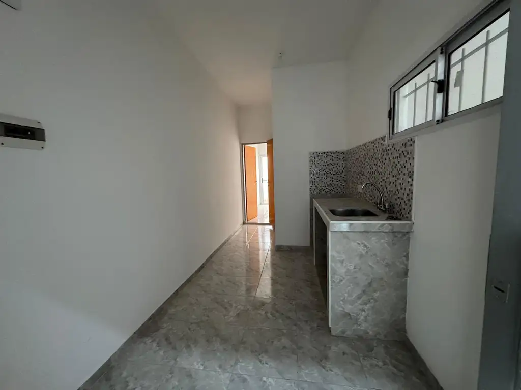 Departamento 2 ambientes con patio en primer piso por escalera. Consta de: cocina comedor equipada con mesada con bacha y termo eléctrico, baño, habitación y pequeño patio.