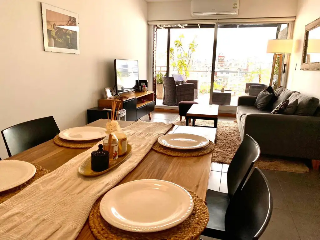 Capacidad para 2 adultos con bacon aterrazado, PARRILLA privada, 1 habitación, 1 cocina, 1 living comedor y 2 baños. Cuenta con mueblería premium: cama King Size Simmoms con sábanas de algodón egipcio, mesas de luz con mármol carrara italiano, mesa de comedor de madera petiribi maciza, 2 TV y Wifi de alta velocidad.