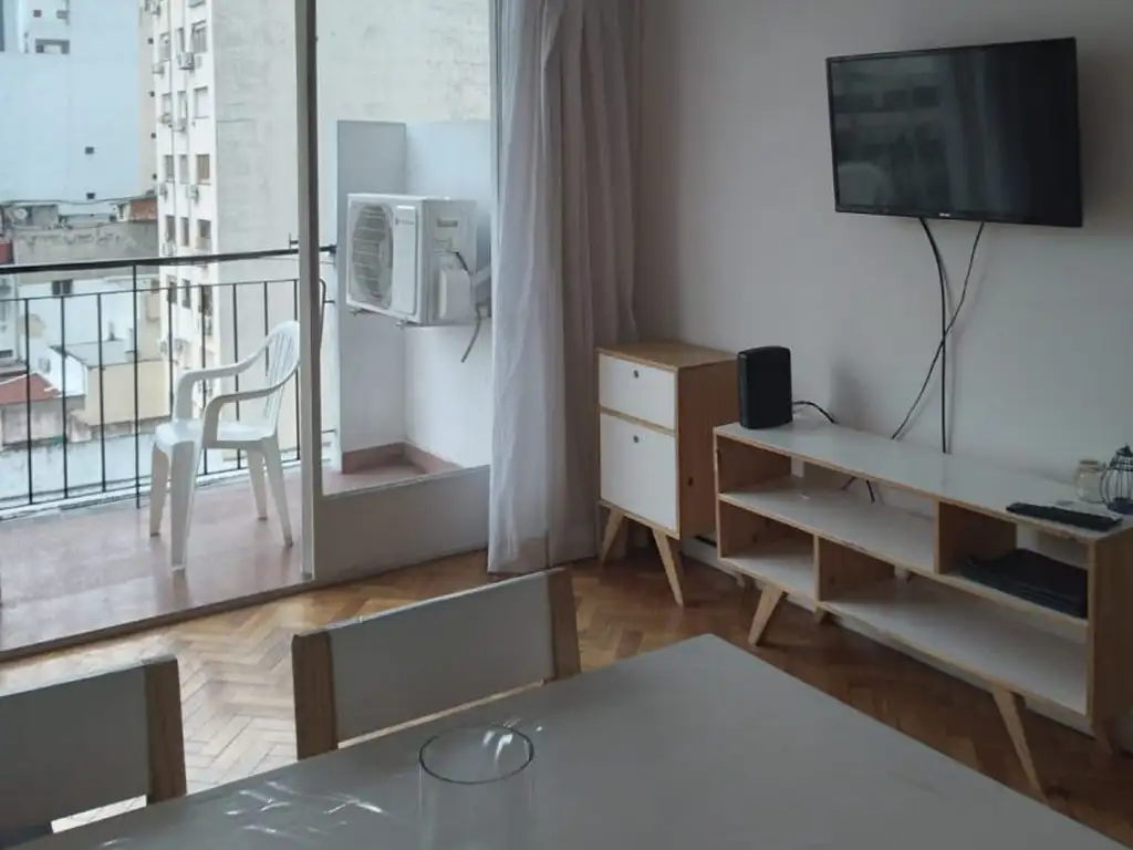 La unidad esta ubicado en el séptimo piso, al contrafrente, lo cual lo hace muy luminoso y tranquilo. El living comedor cuenta con mesa y sillas para 4 comensales, dos sofás individuales y un Smart TV de 32 pulgadas. El equipo de aire acondicionado es frío-calor.