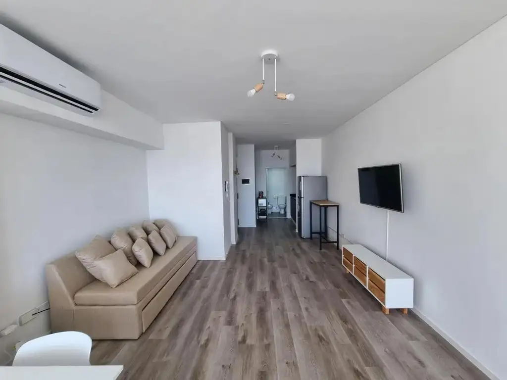 El departamento se entrega totalmente amoblado y equipado, listo para mudarse, con un diseño pensado para el uso diario. El sector dormitorio dispone de una cama de dos plazas con amplio espacio de guardado, mientras que el living ofrece un sillón de generosas dimensiones y un área de comedor integrada. La cocina es completa, con equipamiento eléctrico de primera línea y vajilla incluida. El baño es moderno y funcional, con box de ducha y mampara de vidrio templado, destacándose por su excelente presión de agua.