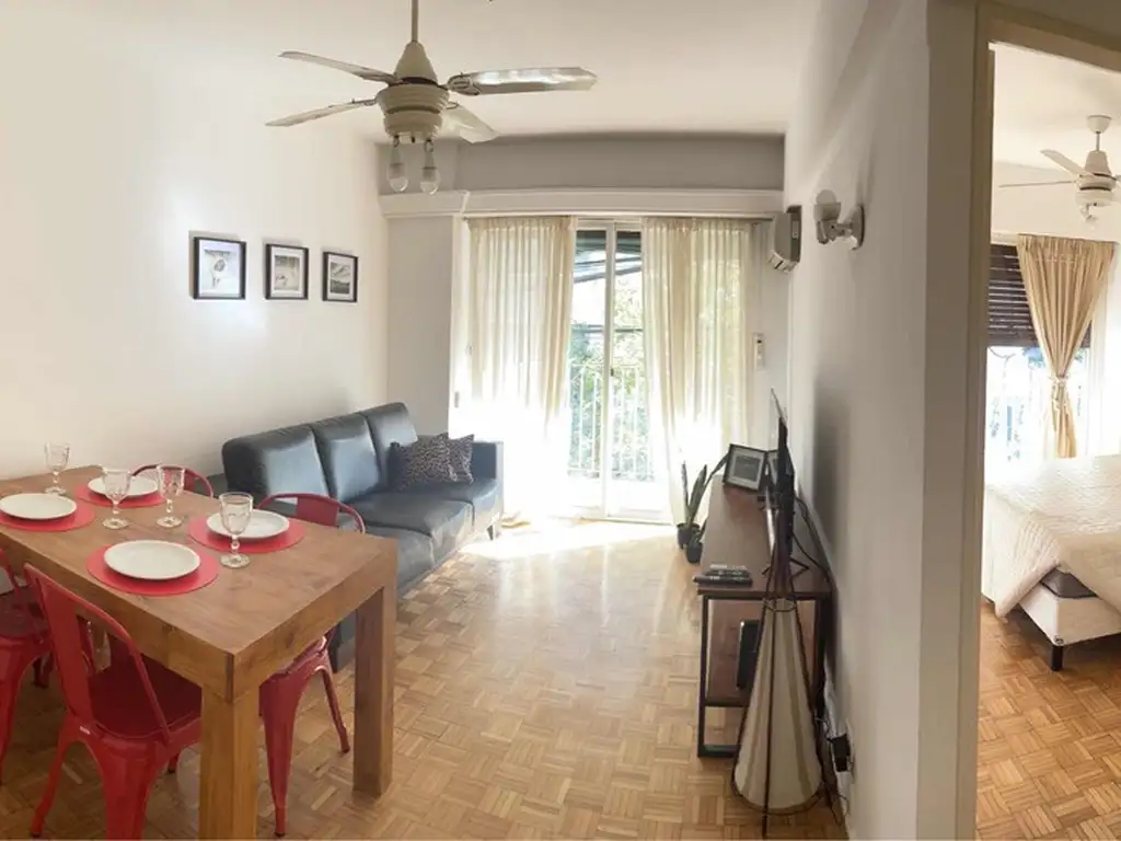 El departamento cuenta con living amplio con sillón, aire acondicionado, mesa con sillas, mueble de tv, con televisión, ventilador de techo.