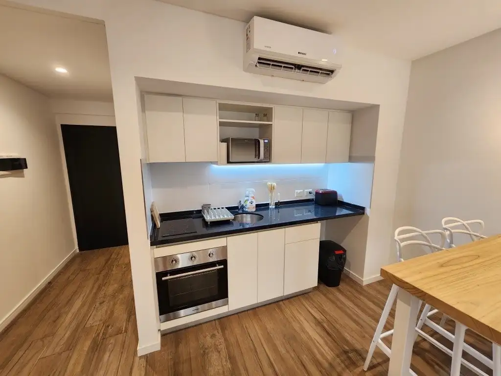 El departamento es un monoambiente grande, con sector de Cocina amoblada con alacena, bajo mesada, cocina de 4 hornallas y horno, tostadora, mesa con 2 sillas, vajilla, decoración, aire acondicionado, heladera.