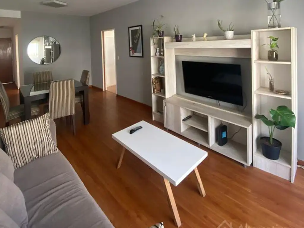 La unidad cuenta con un amplio living comedor que cuenta con estufa de tiro balanceado, con salida al balcón, juego de comedor para 4 personas y un sillón, frente a un modular con una TV de 42 pulgadas y un Chromecast.