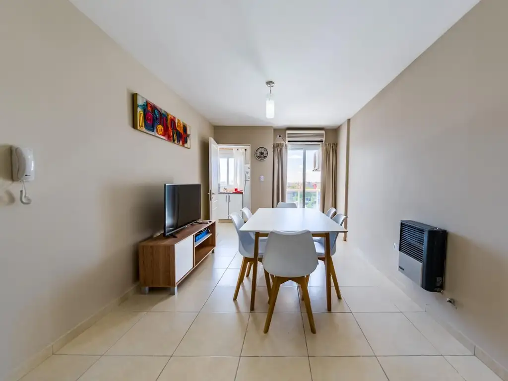 - Living/Comedor con Mesa y Sillas con un Sillón de dos cuerpos, TV Smart, Aire Acondicionado frio/calor y Balcón.