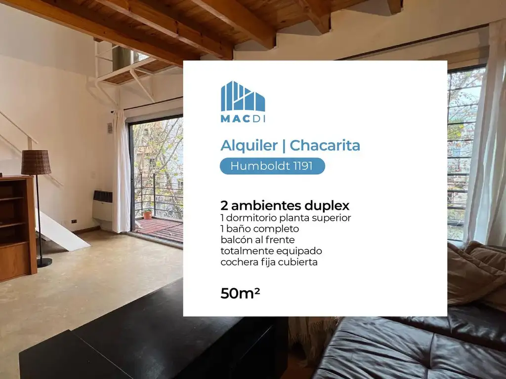 2 ambientes en dúplex. 1 baño completo. 1 dormitorio en planta superior.