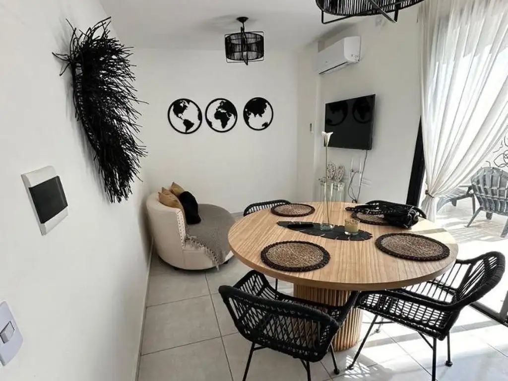 Consta de ingreso principal al living comedor, cocina. Sectorizada, con barra desayunadora, salida a amplio balcón terraza. Baño completo, dos dormitorios con placares. Full amoblado! Aire acondicionado, TV.